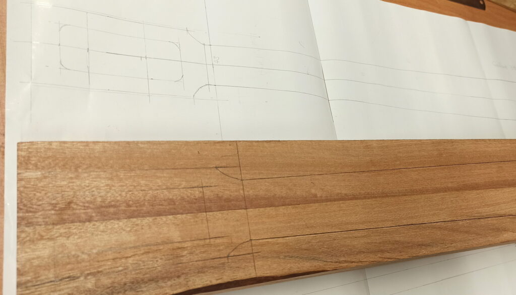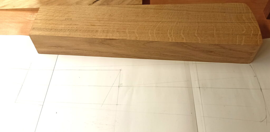 Die Überlegung nun, wie das zusammengeführt werden sollte. Ziel war, den Hals in den unteren Korpus einzulassen und das noch etwas schräggestellt
