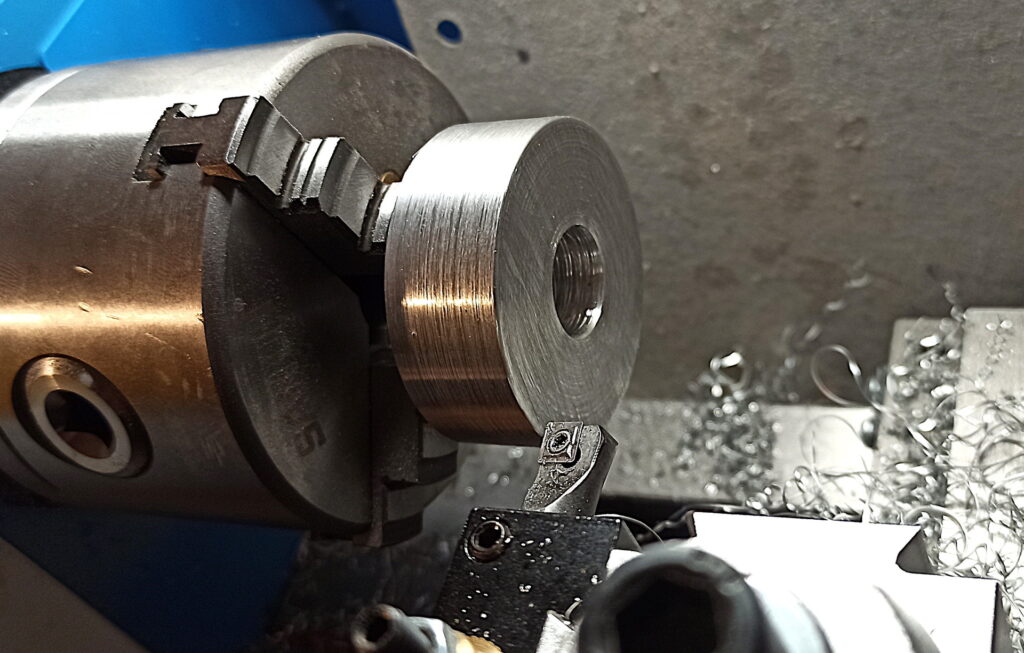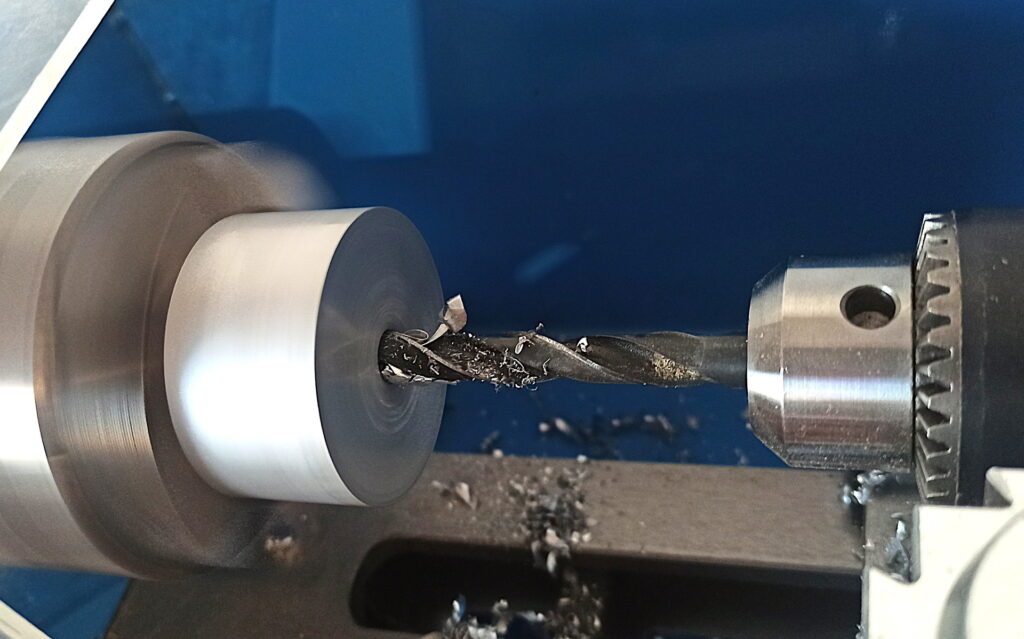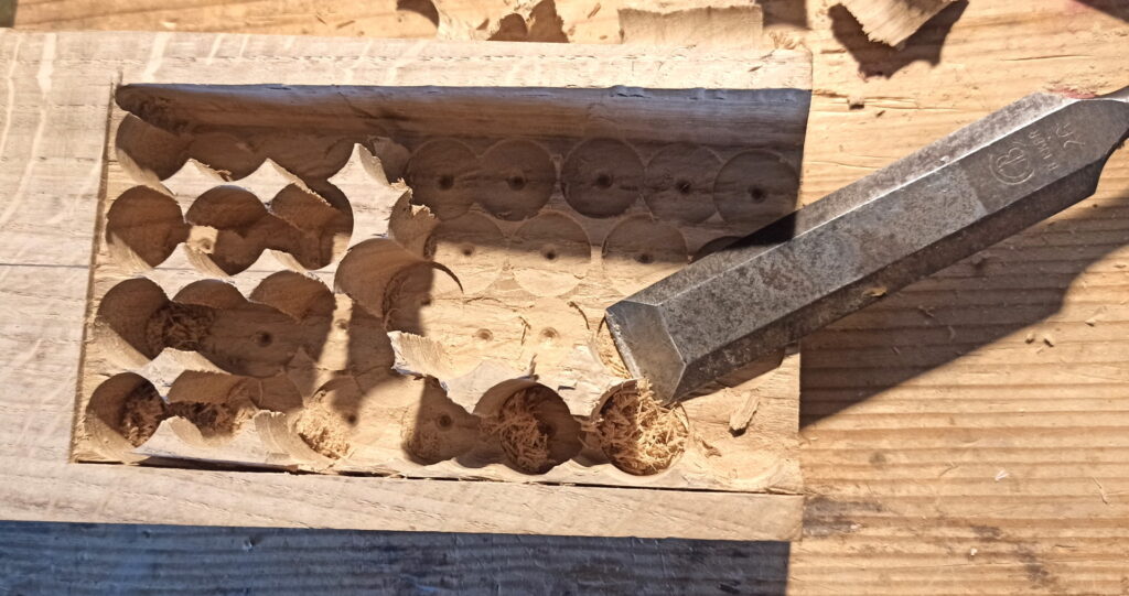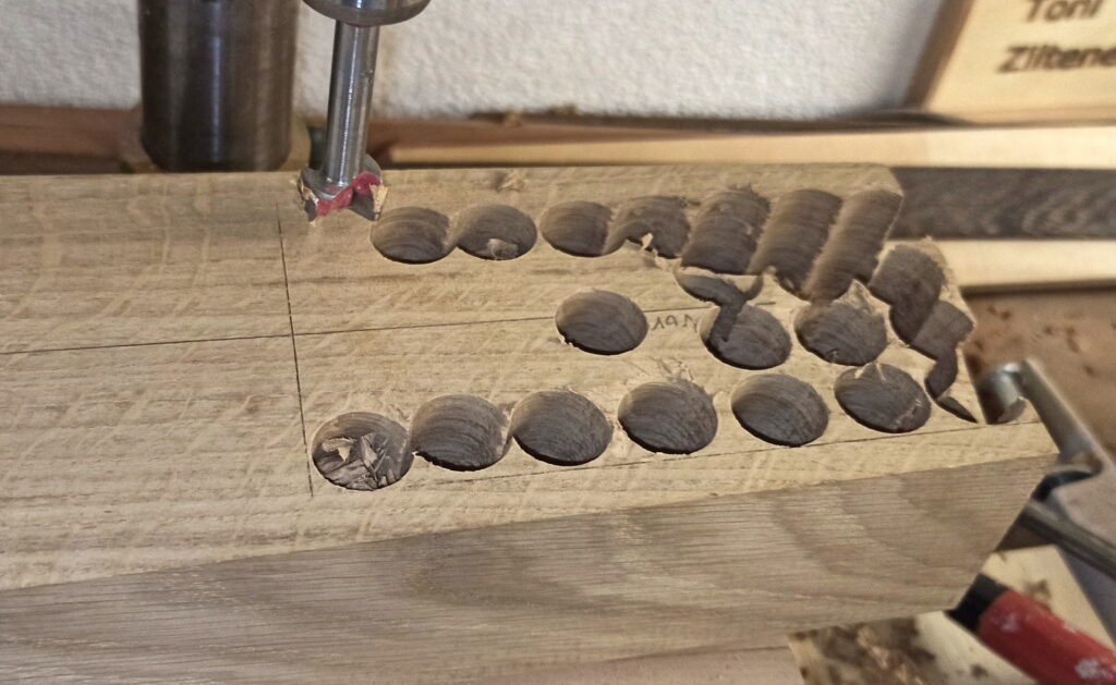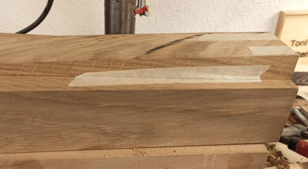 So habe ich unter den Korpus einen schrägen Keil platziert und mit Bohrmaschine die Aussparung gebohrt und Reste entfernt