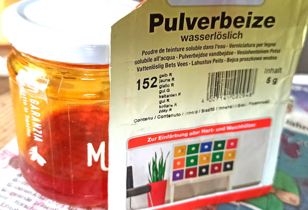 Jetzt ging es an die Farbe. Habe mich entschlossen, den Korpus mit Pulverbeize Gelb von Clou zu colorieren und den Mahagonihals zu schwärzen (mit Mischung aus Essigessenz und Eisen)