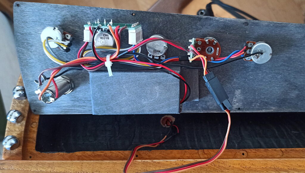 Piezo Tonabnehmer einfach unter Steg geklemmt. Diese lassen sich getrennt mischen