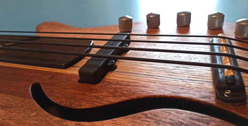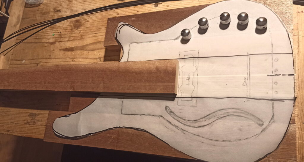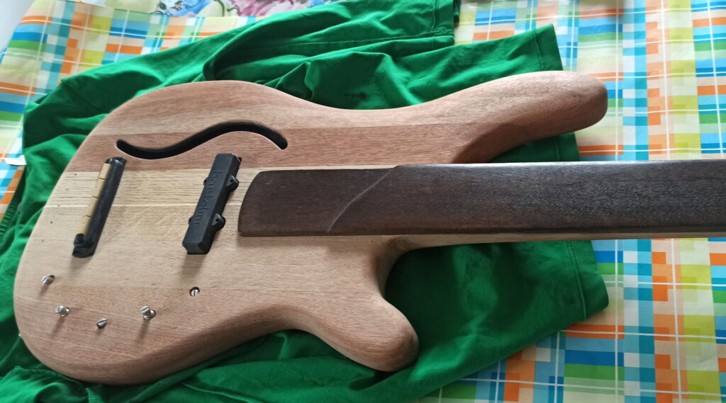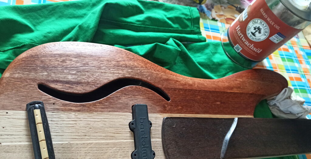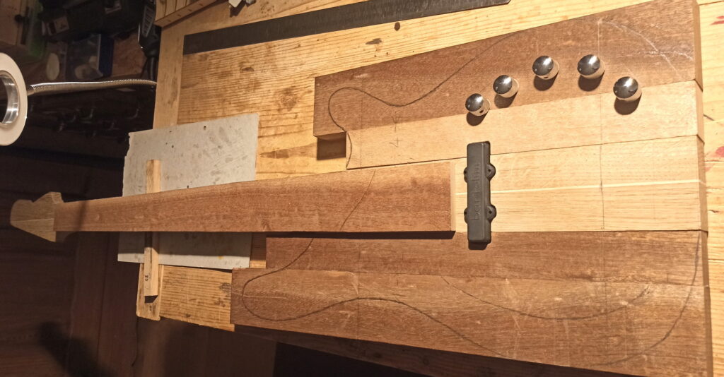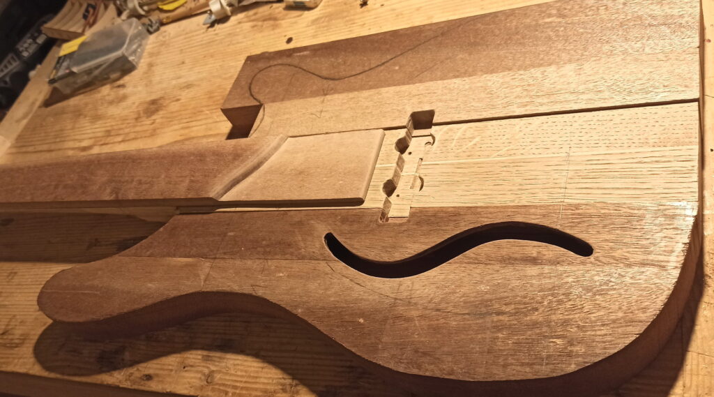 Ziel war, alles Holz lagernd in der Werkstatt zu verwenden. Zudem der Korpus ausgehöhlt, um schon ohne Verstärker einen brauchbaren Grundton zu erhalten.