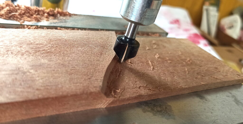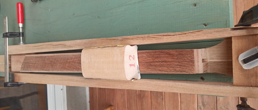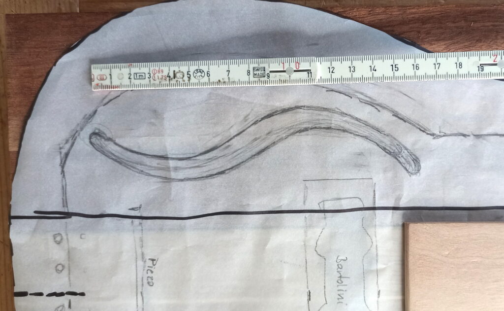 So sollte die Form werden. Die angebauten Mahagoniteile habe ich vorher von der Seite her ausgefräst, damit diese nach dem Zusammenkleben ein Hohlraum bilden