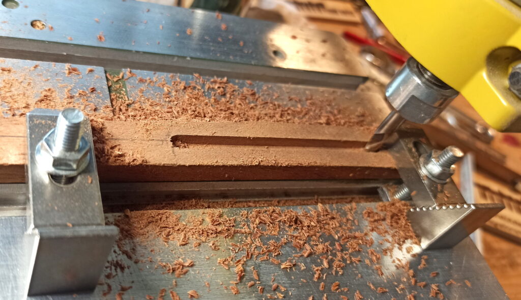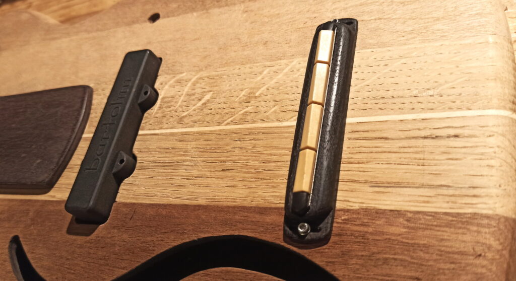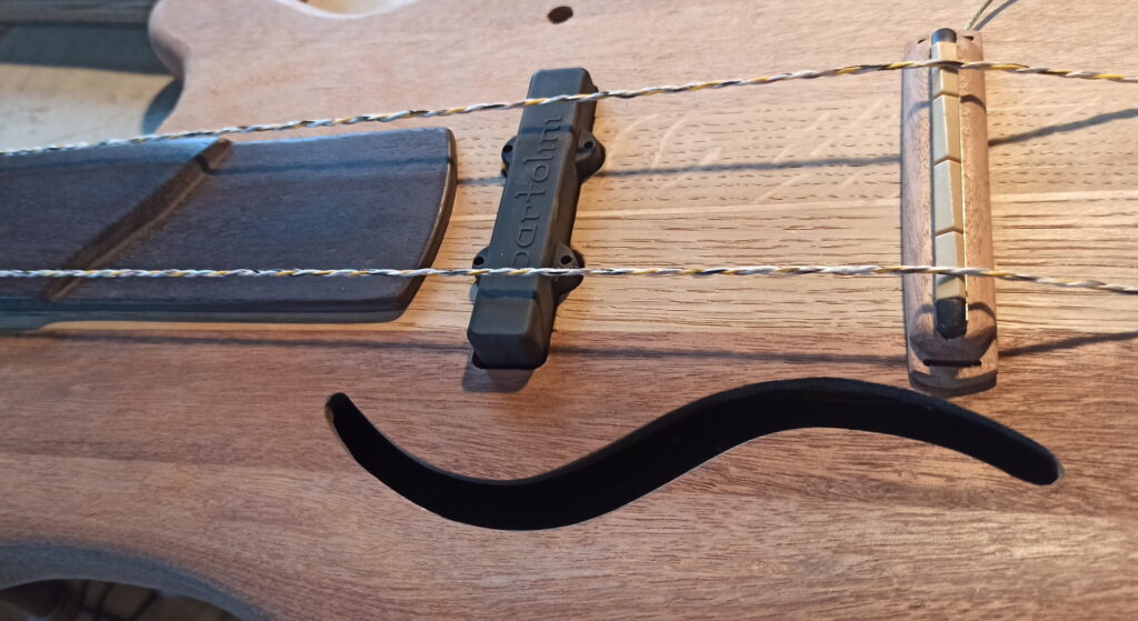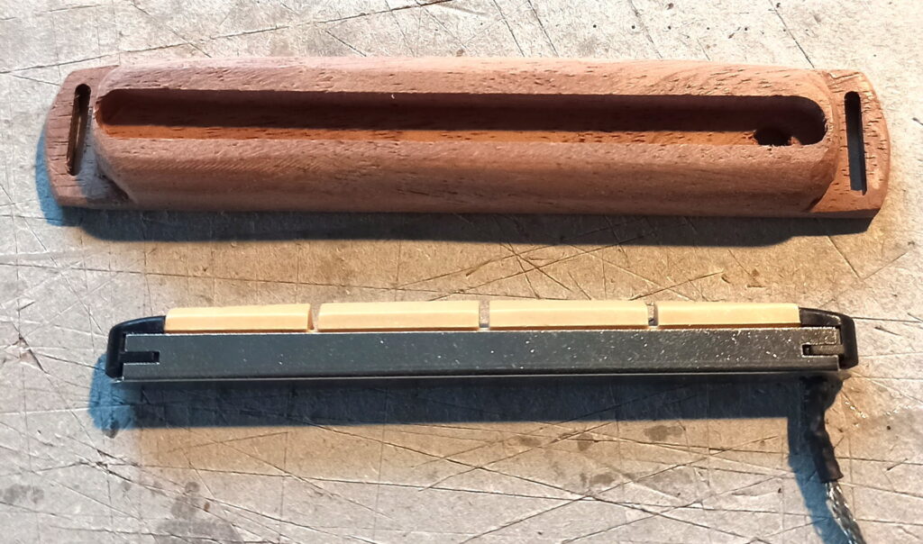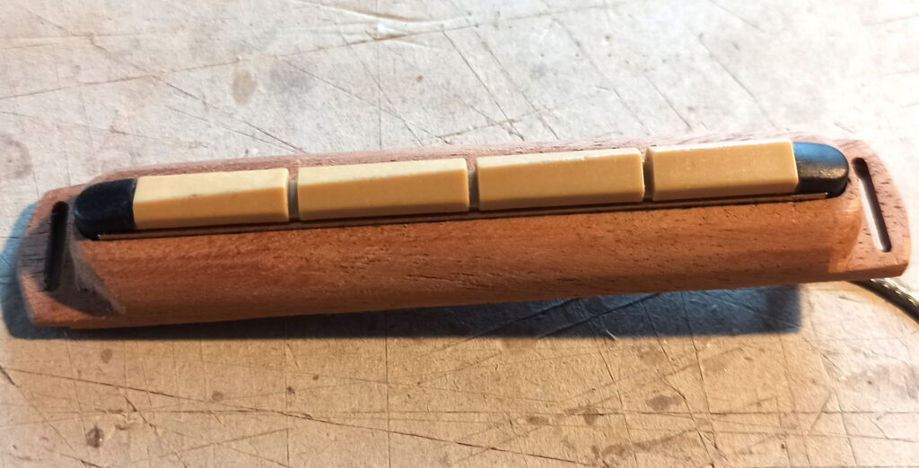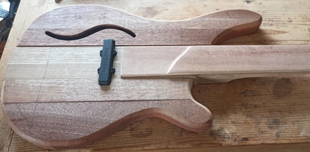 Hier hab ich aus einem Stück Mahagoni den Halten für den Piezo Tonabnehmer geformt