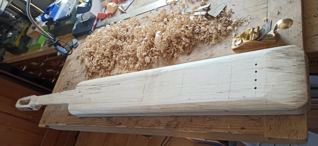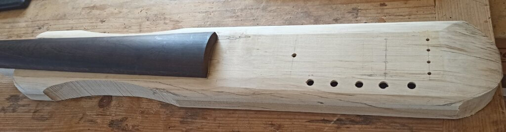 - Der Korpus wurde aus einem Stück Eschenholz mit den Massen 110/11/4cm geformt.