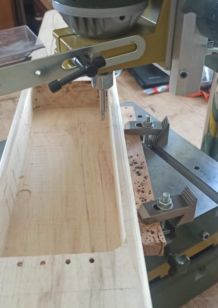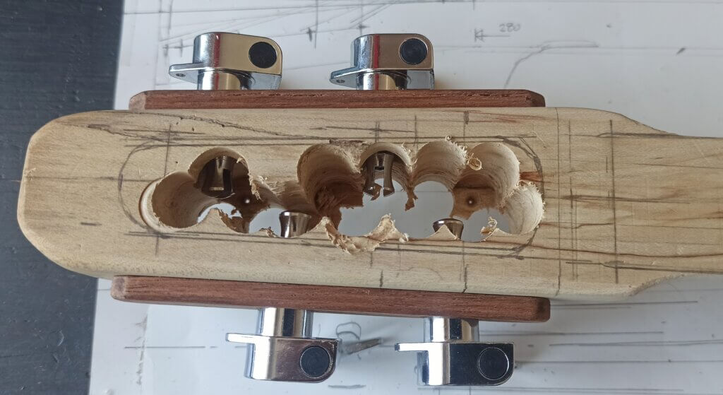 Fräsarbeiten an der Rückseite. Extra grosses Fach für Hohlraum um etwas Resonanzkörper zu haben. Restmaterial an der Decke bei 5mm Dicke. Da kommt beim Spielen ohne Elektronik dann auch schon etwas mehr Ton. War zumindest meine Vorstellung