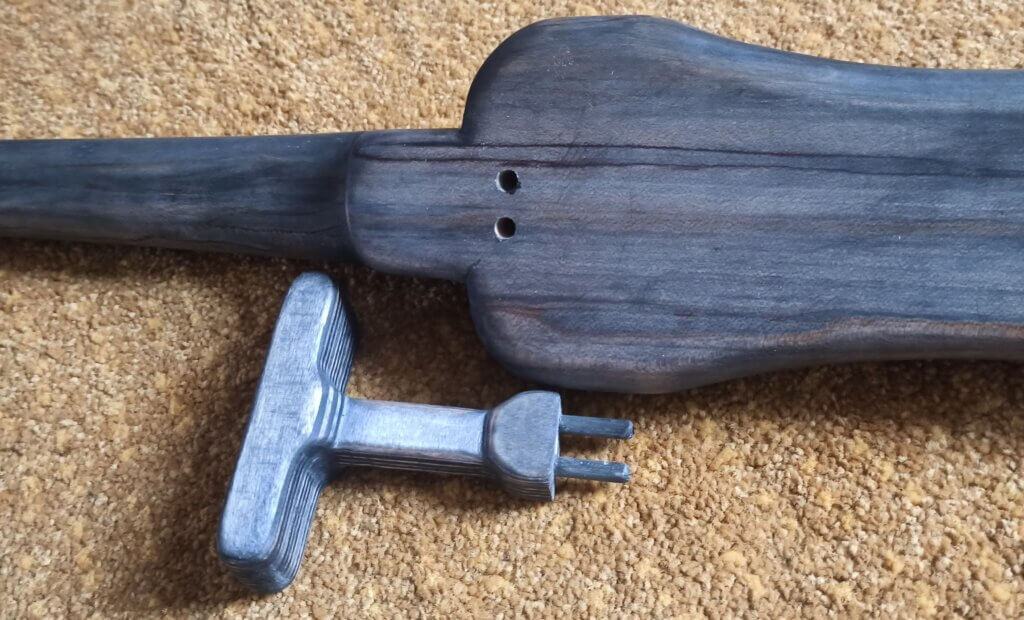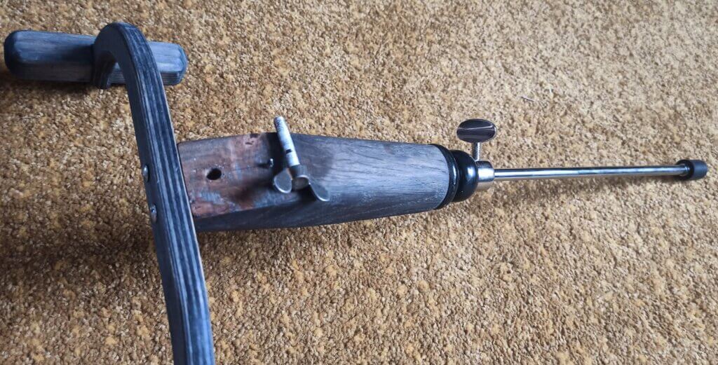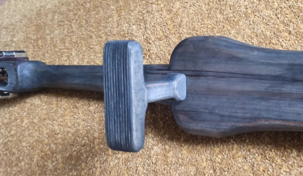 Ach ja, die Oberfläche vom Korpus hab ich zunächst mit Beize und dann Leinölfirnis behandelt. Die Knöpfe hab ich aus Alu gedreht und nur aufgesteckt.