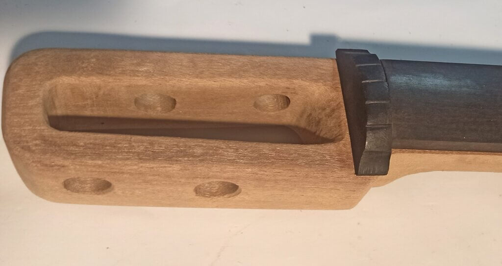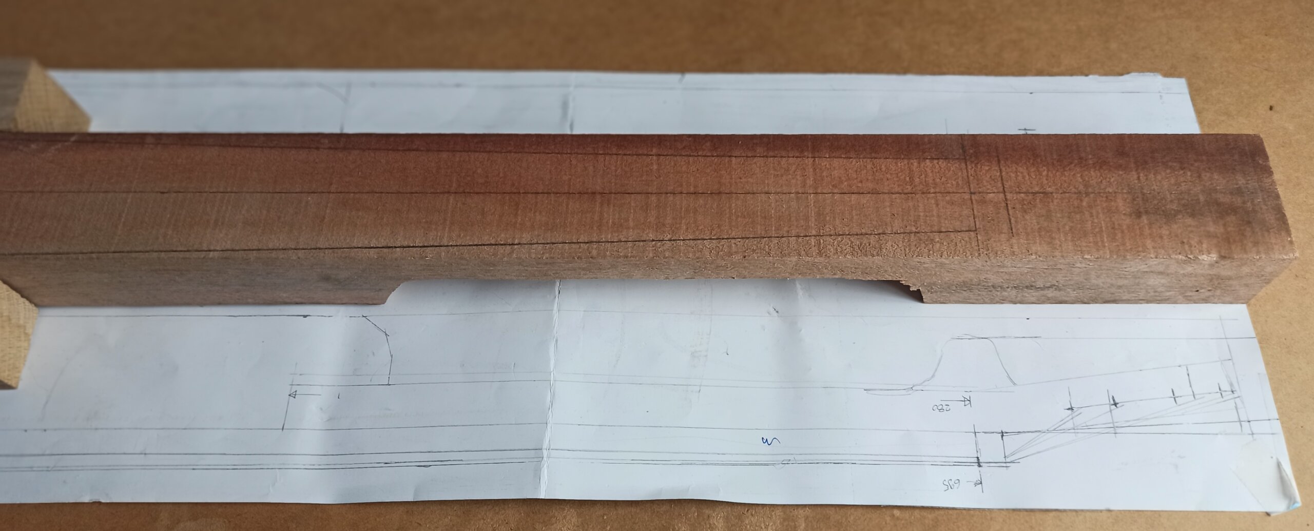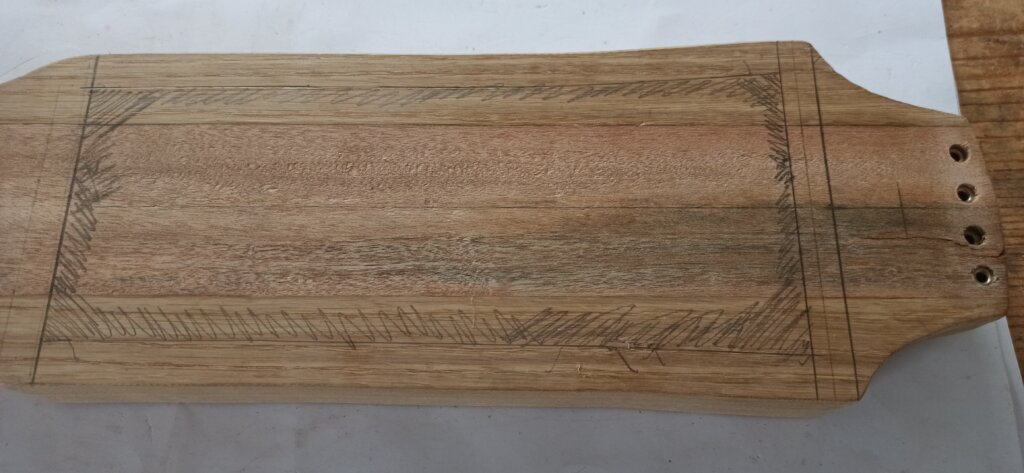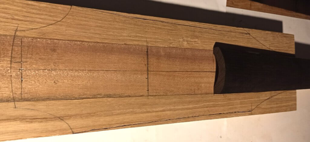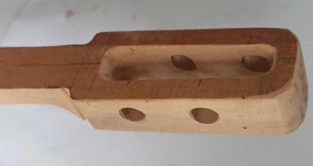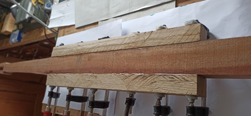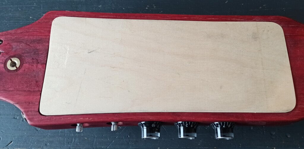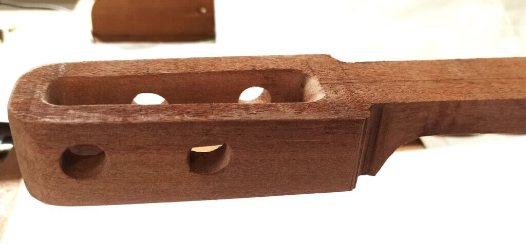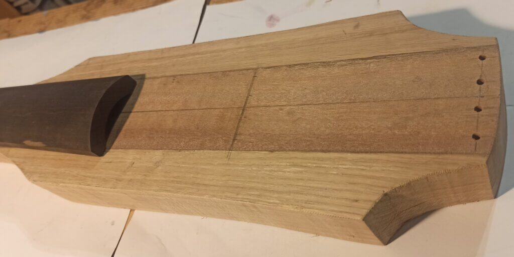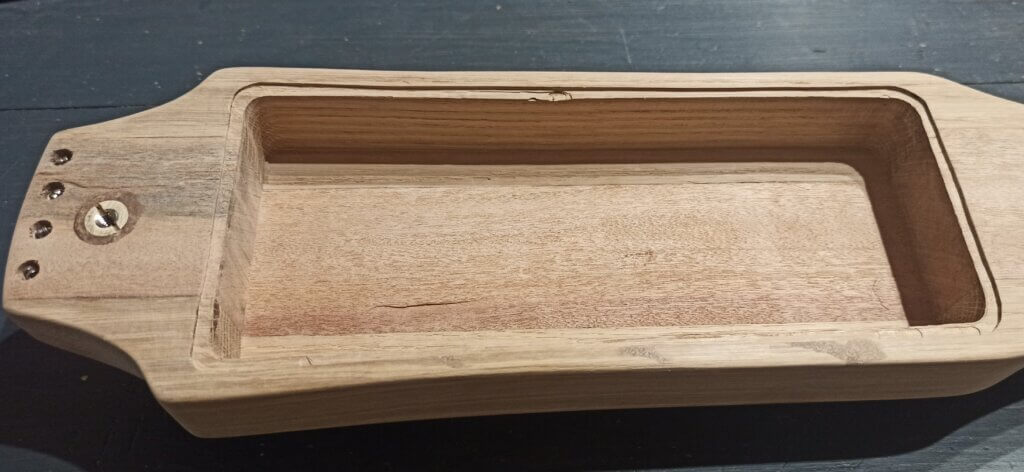 Der Korpus wurde aus zwei langen Streifen Mahagoni und seitlich zwei Streifen (ich glaube) Eiche geformt.