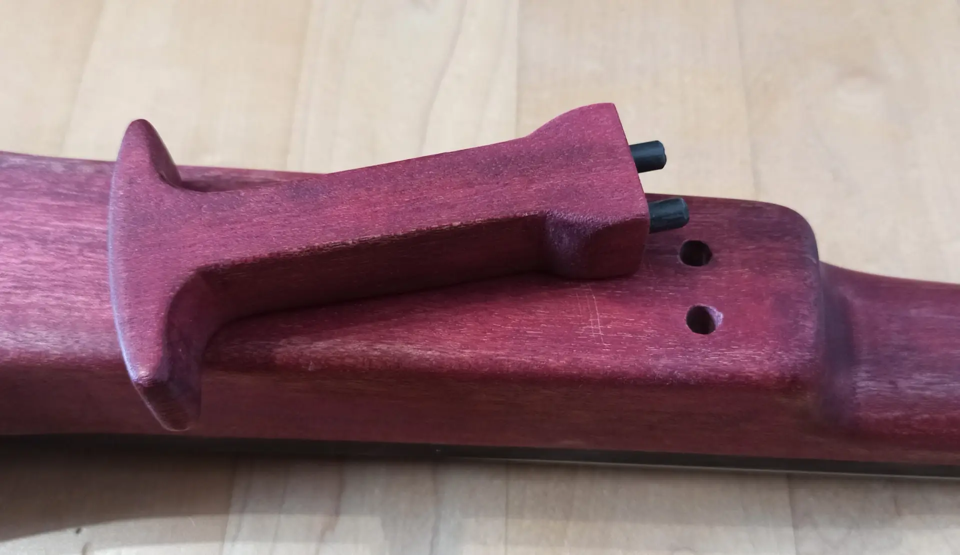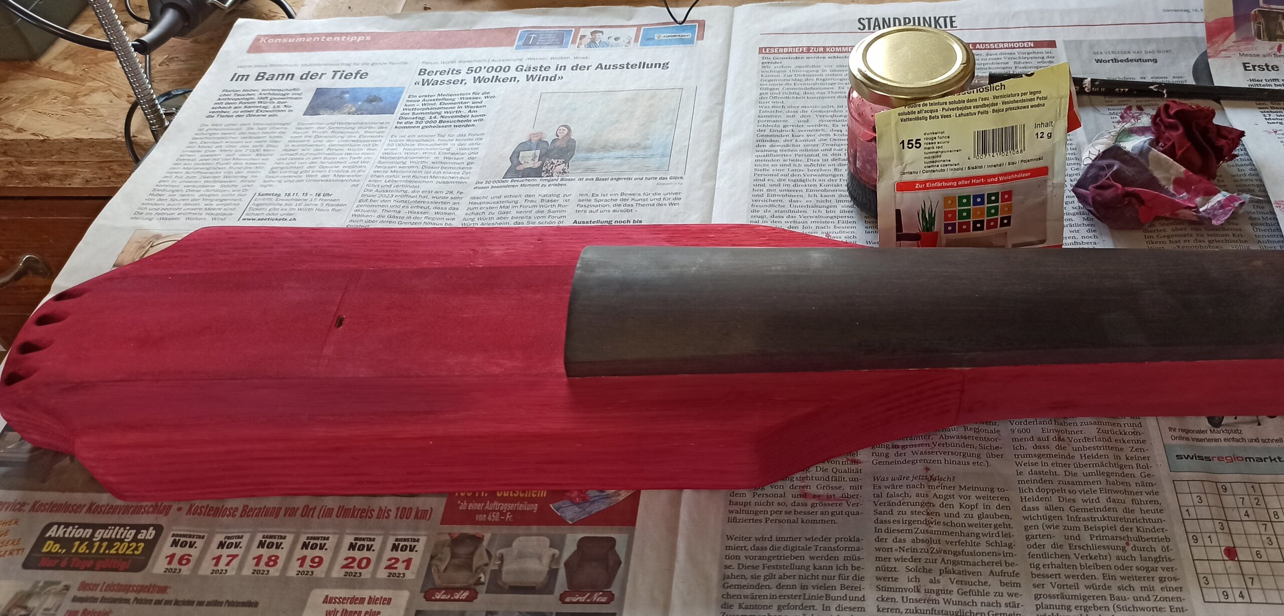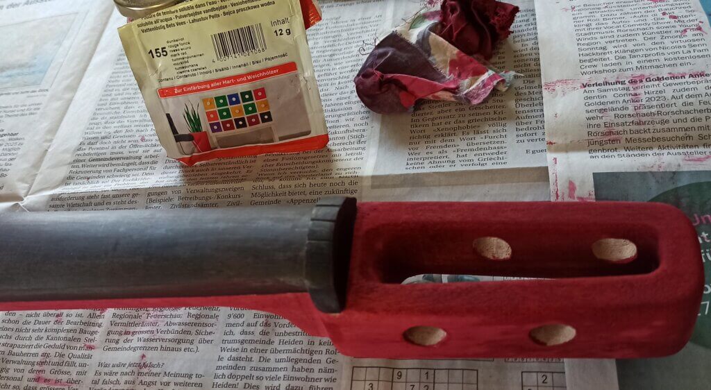 Mit roter Pulverbeize von Clou wurde nun der Korpus coloriert nach dem Trocknen zwei mal mit Leinölfirnis eingelassen